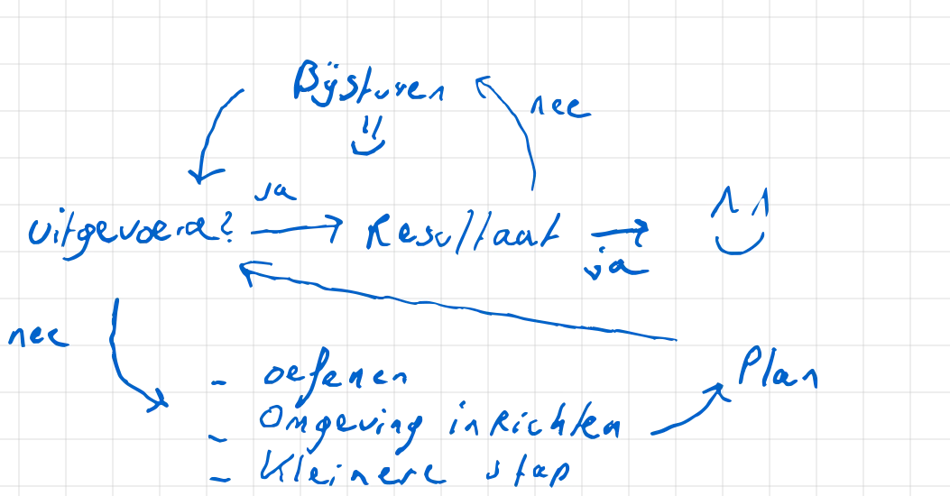 Vaak kom je erachter dat bepaalde stappen van je doel te groot zijn. Het kan ook zijn dat een aantal taken geblokkeerd worden. Stel bijvoorbeeld dat je elke ochtend een eitje wil klaarmaken voor je doel om af te vallen. Als je aanrecht vol staat dan gaat dat wat lastig. Het kan dan helpen, om als actie op te nemen dat je in de avond in ieder geval potten en pannen afwast.